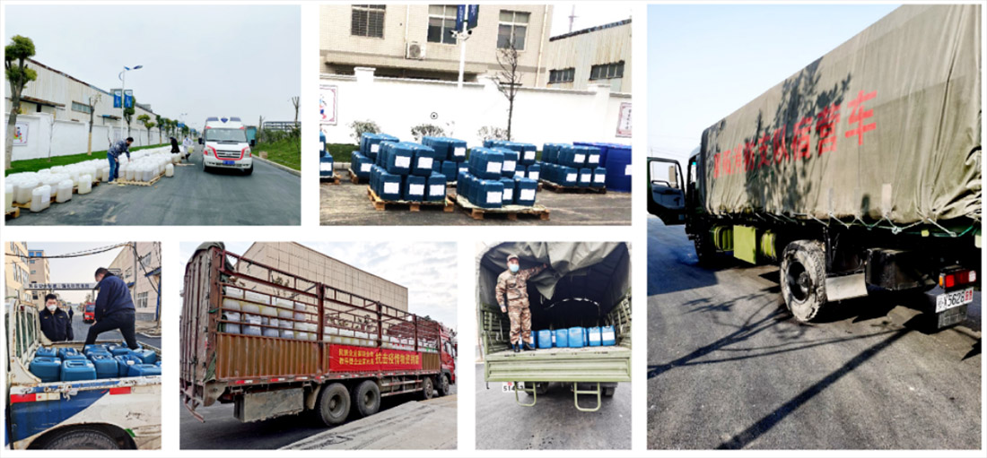 2020年年初新冠疫情全面爆发,湖北又是全国的疫情中心。国难当头,董事长带领金达成部分领导主动请缨,勇担重任,面临种种困难,发挥党员冲锋在前、迎难而上的作风,生产84消毒液原液三百余吨,市值达四百万,全部无偿捐赠给疫情最需要的地方。